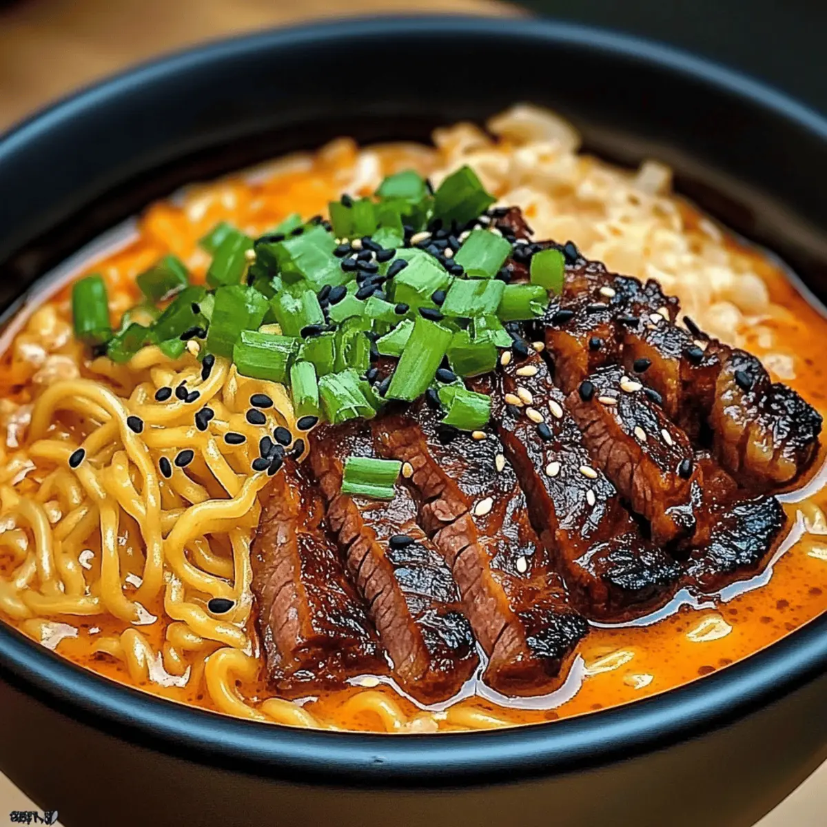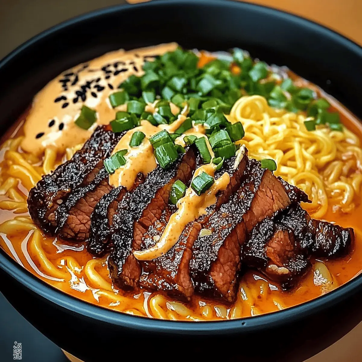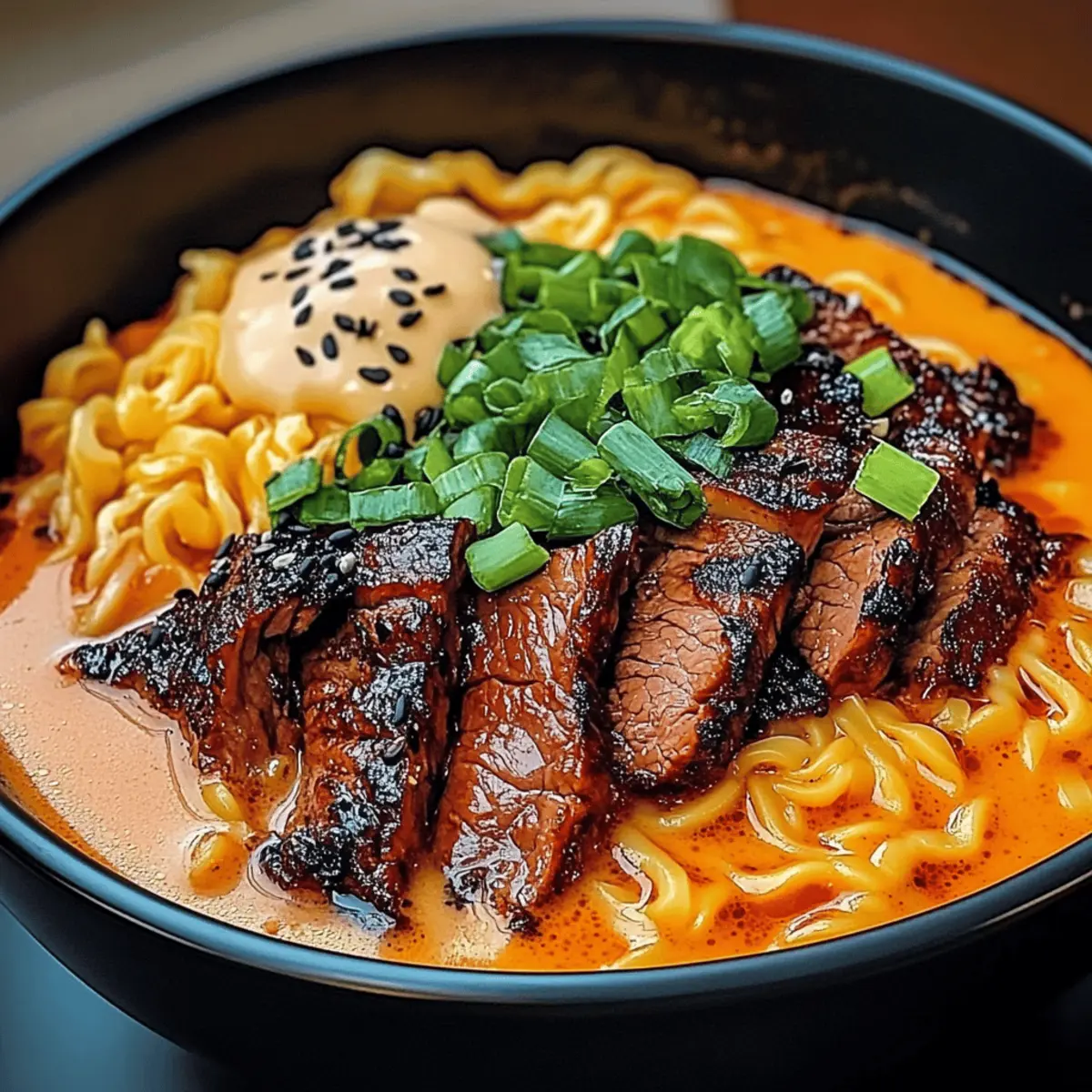 To serve your Spicy Korean Ramen, divide the cooked ramen and broth among large bowls. Generously top each bowl with slices of the grilled beef, then drizzle the creamy sauce over everything. For an extra touch of freshness, garnish with chopped green onions, black sesame seeds, and a drizzle of chili oil or sprinkles of extra gochugaru, depending on your heat preference.