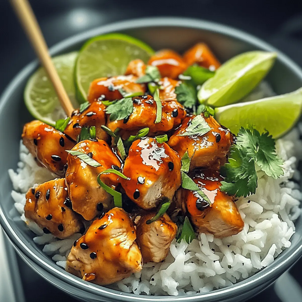 4. Fluff the coconut rice with a fork and spoon it into individual bowls. Place the glazed chicken on top of the rice, drizzle any remaining sauce from the skillet, and garnish with cilantro, lime wedges, toasted coconut flakes, and green onions.