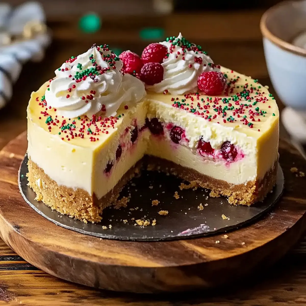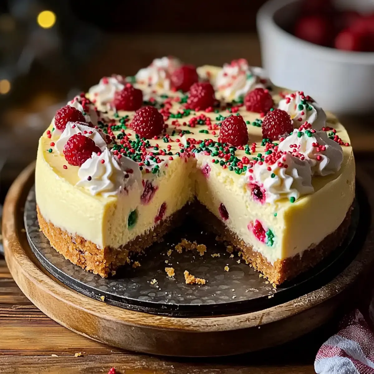 - Carefully remove the cheesecake from the springform pan and garnish with whipped cream, berries, or sugar sprinkles before serving.