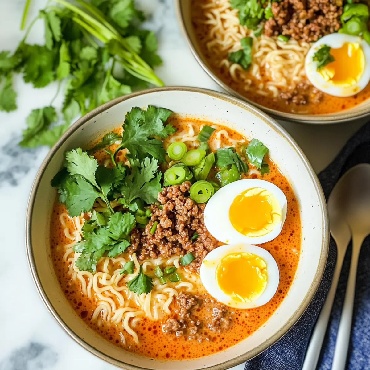 To serve, divide the cooked ramen noodles evenly among bowls and ladle the aromatic broth over the top. Then, generously pile the sautéed ground pork on the noodles, and top each bowl with halved soft-boiled eggs, fresh cilantro leaves, chopped green onions, and a sprinkle of toasted sesame seeds for that final touch.