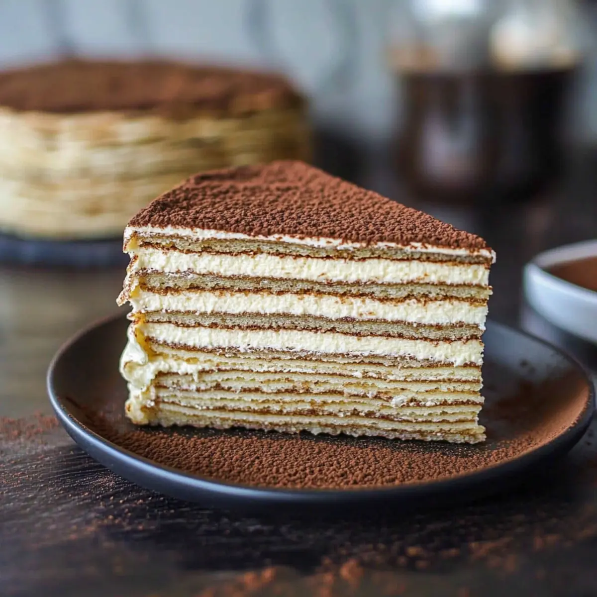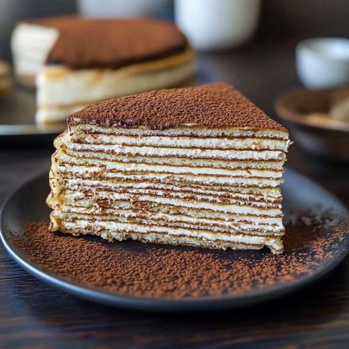 - Dusk for Elegance: When dusting cocoa powder on top, use a sifter for an even layer. This gives your Tiramisu Crepe Cake a lovely finish that’s visually appealing.
