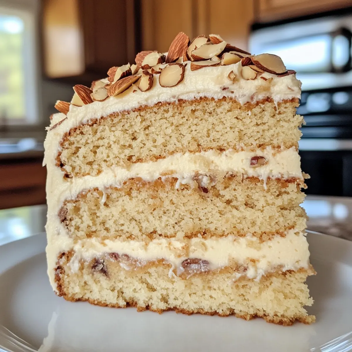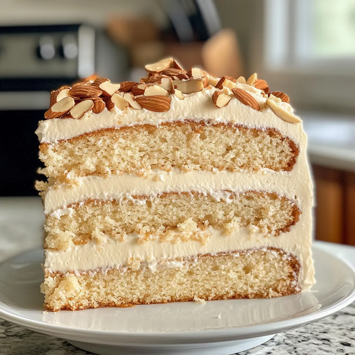 This Toasted Almond Cream Cake features moist layers of almond vanilla sponge frosted with almond buttercream and toasted almonds, perfect for any occasion.