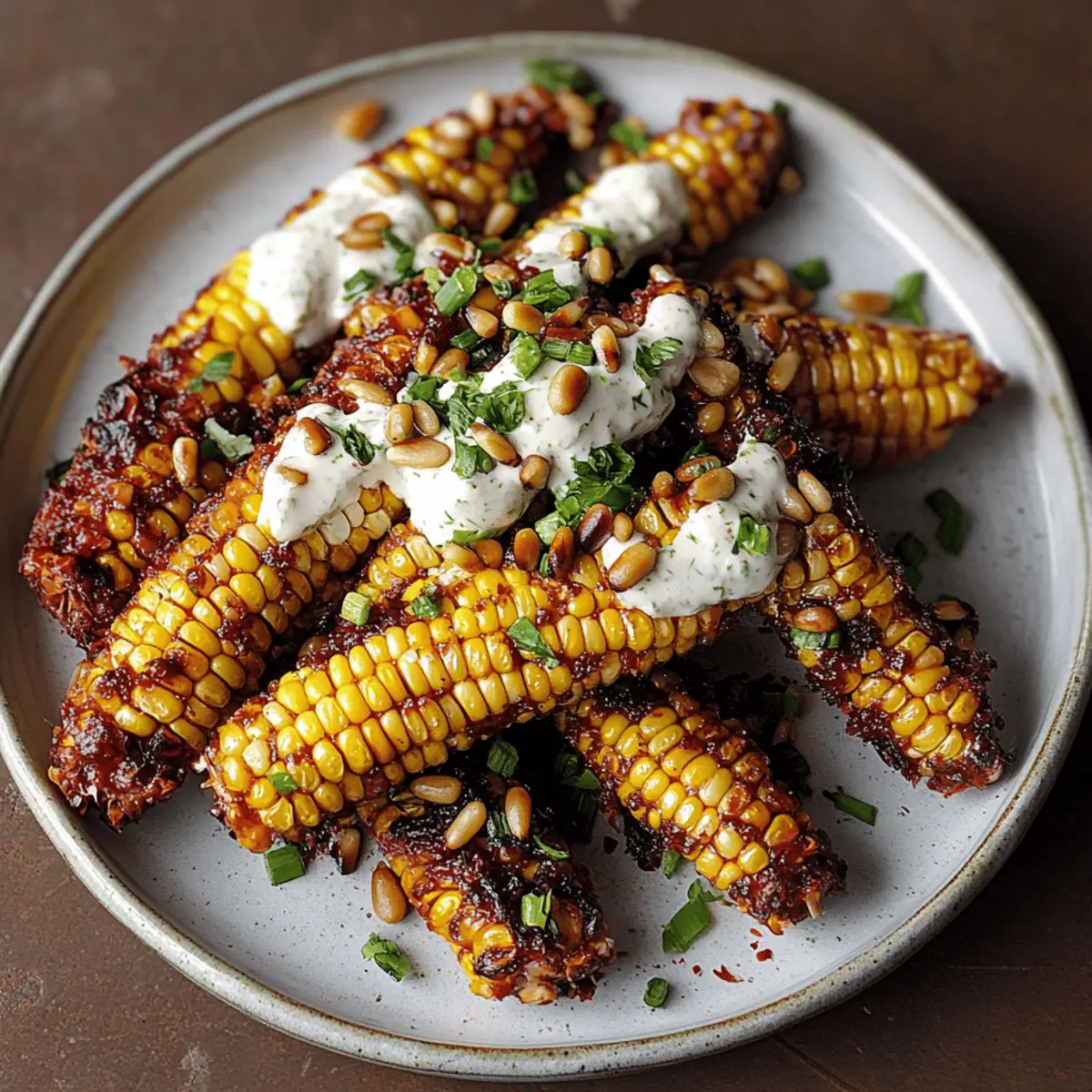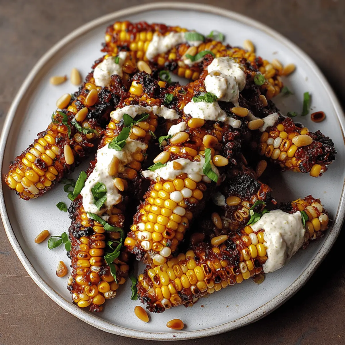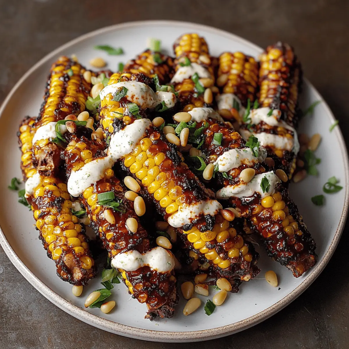Once the corn ribs are perfectly cooked, remove them from the air fryer or oven. Plate the ribs beautifully and drizzle generously with the Aleppo chili butter. Dollop the lime zest cream cheese on top, then finish off with a sprinkle of toasted pine nuts, chopped green onion, and fresh herbs for a pop of color and added flavor.