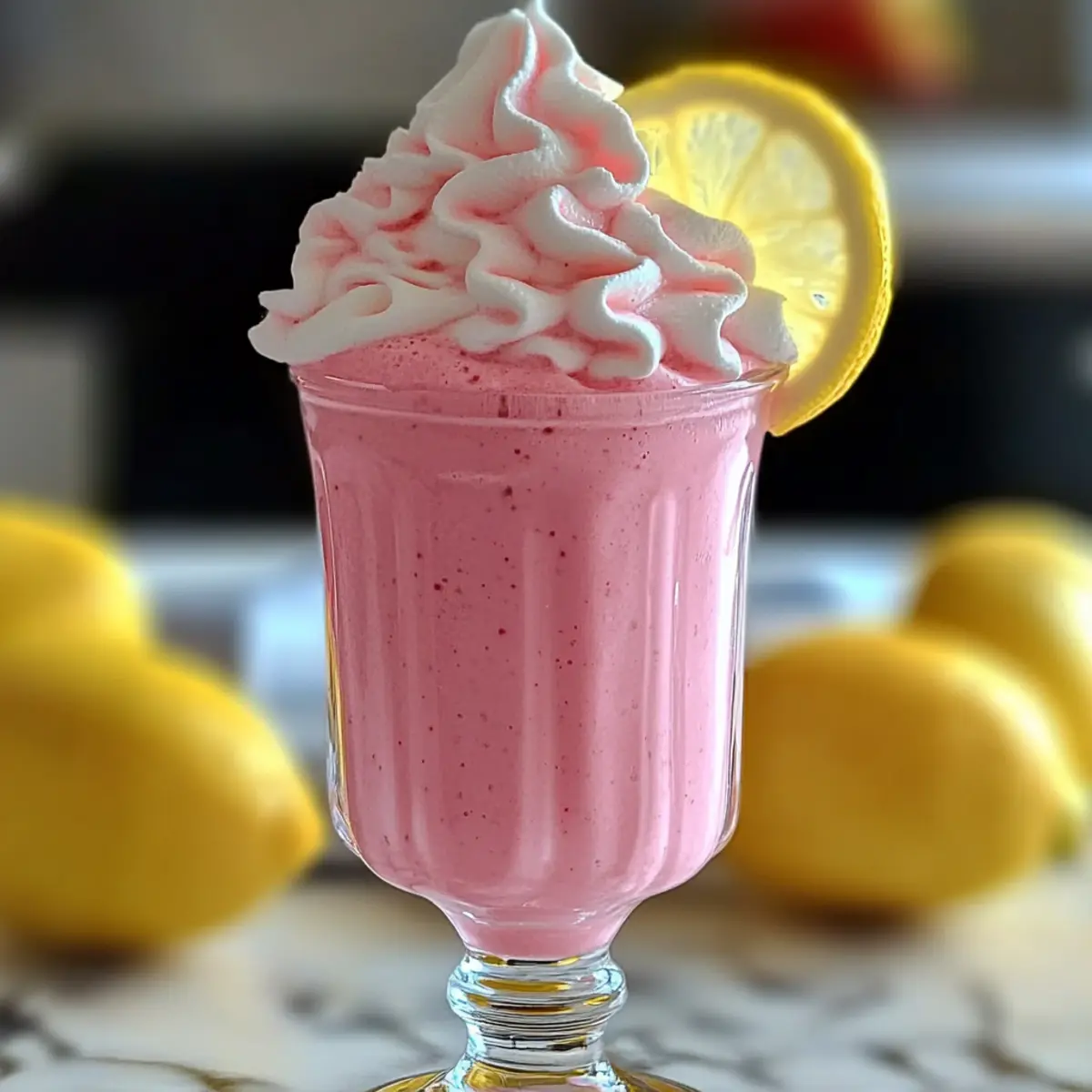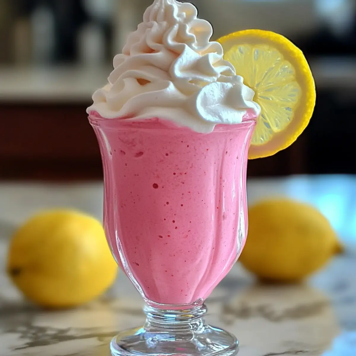 - Pour the whipped pink lemonade into chilled glasses and top each with a lemon slice and whipped cream for a beautiful finish.