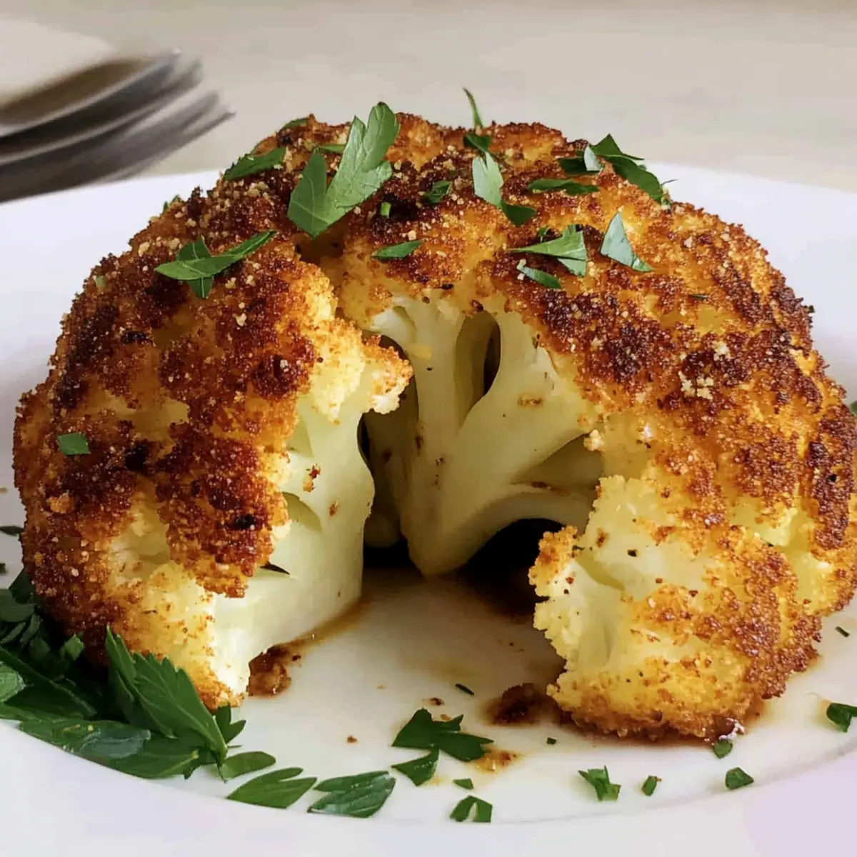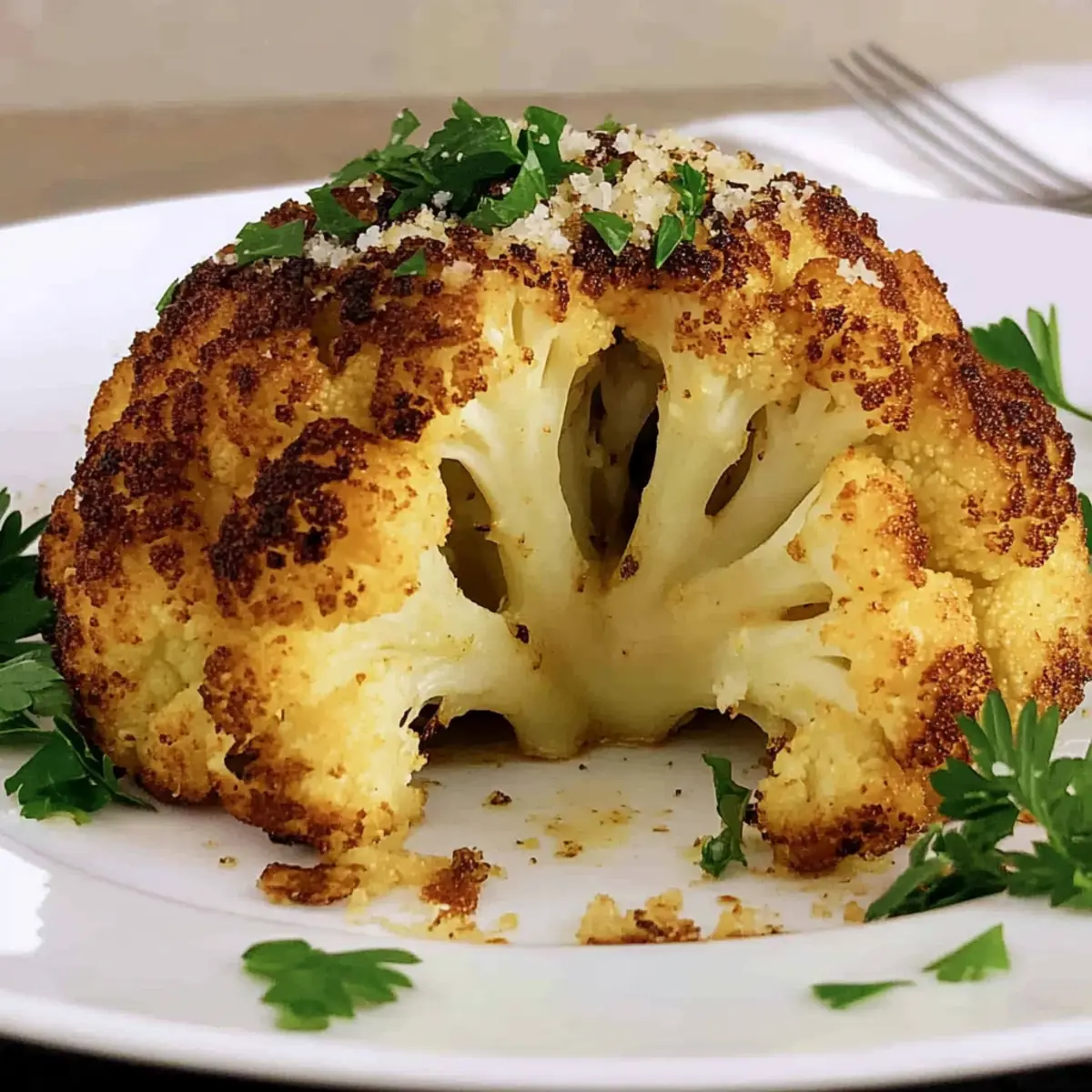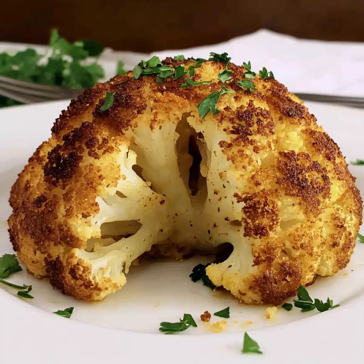 Visual Delight: The whole roasted cauliflower not only radiates beauty but also serves as an impressive centerpiece for any meal. Savory Goodness: Infused with garlic, herbs, and a crispy parmesan crust, each bite is an explosion of flavor. Quick Prep: With just 5 minutes of prep, this dish is perfect for busy weeknights or special occasions. Versatile Pairing: It complements a wide range of main dishes, making it a go-to side for any table. Diet-Friendly: Adhering to keto and gluten-free diets, this recipe caters to various dietary needs without compromising deliciousness.